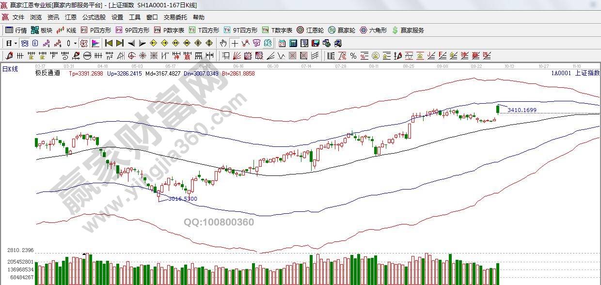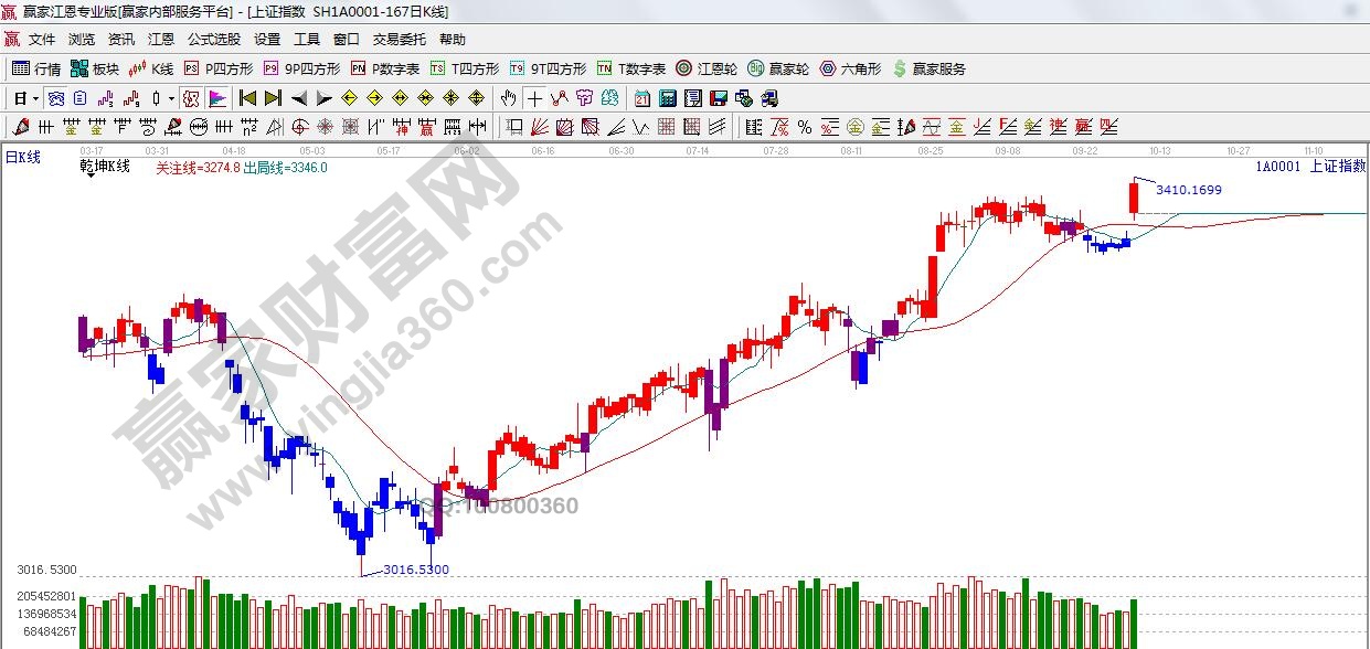 江恩看盤綜述:依據贏家江恩技術工具分析得出:周一,兩市大幅高開,節中積攢的大量利好,得到集中釋放。滬指日線直接達到極反通道藍色線,隨后震蕩回落,但仍保持跳空上漲態勢。極反藍色線3419點,預計短期高位震蕩或回踩60分生命線3357點支撐為主,繼續暴漲的概率不大。整體以震蕩慢牛結構行情為主。接下來題材股或將輪番表現,操作上,關注三季報概念。