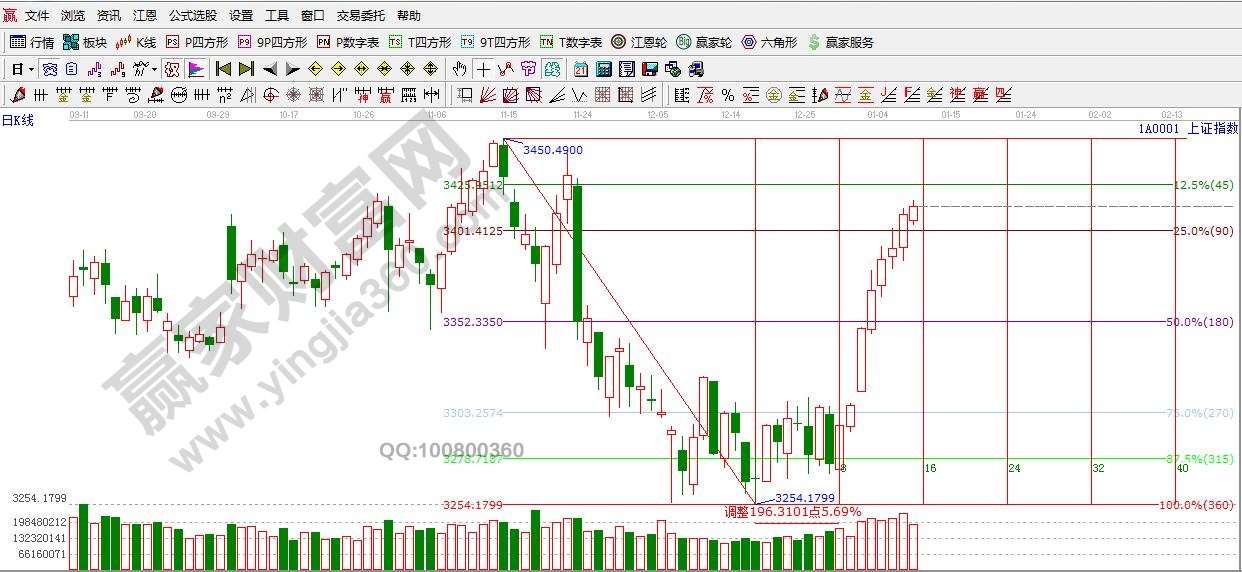 江恩看盤綜述:依據(jù)贏家江恩技術(shù)工具分析得出:周二,滬指在3400點之上整理,繼續(xù)保持強(qiáng)勢勢頭,但量能明顯縮小。在1月10日短線窗口臨近之際,縮量上行下短期將迎來調(diào)整,盤中支撐重點關(guān)注90度3401點。阻力位江恩45度線3425點附近,操作上,建議短線切勿盲目追漲,逢高減持降低倉位為主,個股上繼續(xù)關(guān)注成長性良好的超跌股以及年報預(yù)增的標(biāo)的。