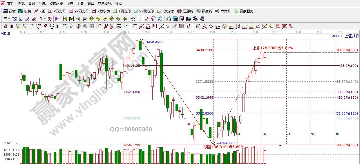 ★依據贏家江恩理論系統江恩波段百分比提示:滬指盤中再次回踩90度3400附近后回升,短線支撐依舊是3401點,以及240度3380附近。阻力位關注百分比45度線3425點附近。