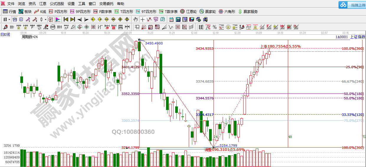 ★依據(jù)贏家江恩理論系統(tǒng)江恩波段百分比提示:滬指在創(chuàng)日線新高,短線支撐依舊是3401點(diǎn),以及240度3380附近。