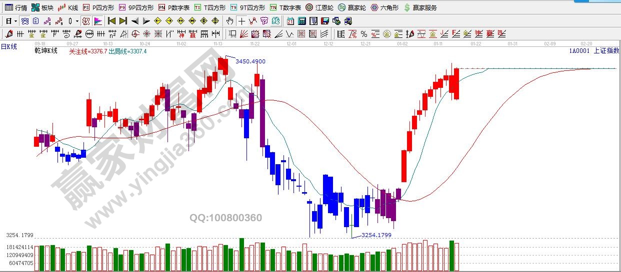 ★依據贏家江恩理論系統乾坤K線提示:紅色可操作區域,滬指重新收復了短線出局線,依據規則,出局線之上,短波看多。