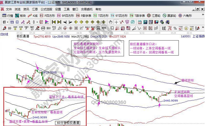 ★依據贏家江恩理論系統極反通道提示: 日線連續兩日收在生命線上方,按照規則量能保持且3天回踩不破,則確認生命線突破的有效性,空間上看高藍線2680方向。附60分鐘極反通道圖顯示,股價運行到藍線2620壓力區,短線不能強勢突破,仍有回落生命線需求。則,短線支撐參考生命線2579點,壓力參考60分鐘藍線2630點。