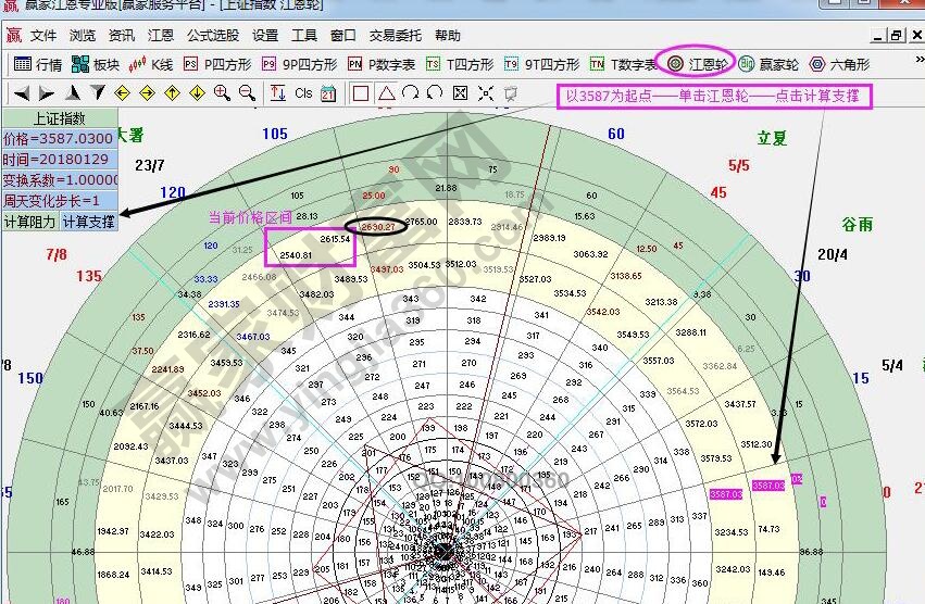 ☆依據贏家江恩理論系統江恩輪中輪提示:以3587為起點,做江恩輪上輪時空分析圖。空間上受阻2615壓力點,突破則進入下個角度2690;反則,將繼續確認2540支撐。
