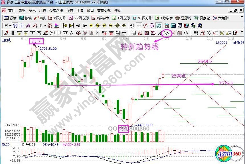 ★依據贏家江恩理論系統轉折趨勢線提示:以2703為起點,2440為終點做轉折趨勢線,周一指數剛好高開在2598后獲得支撐震蕩走高。當前2598為支撐,站穩則看高壓力2644點,失守則考驗2576點。