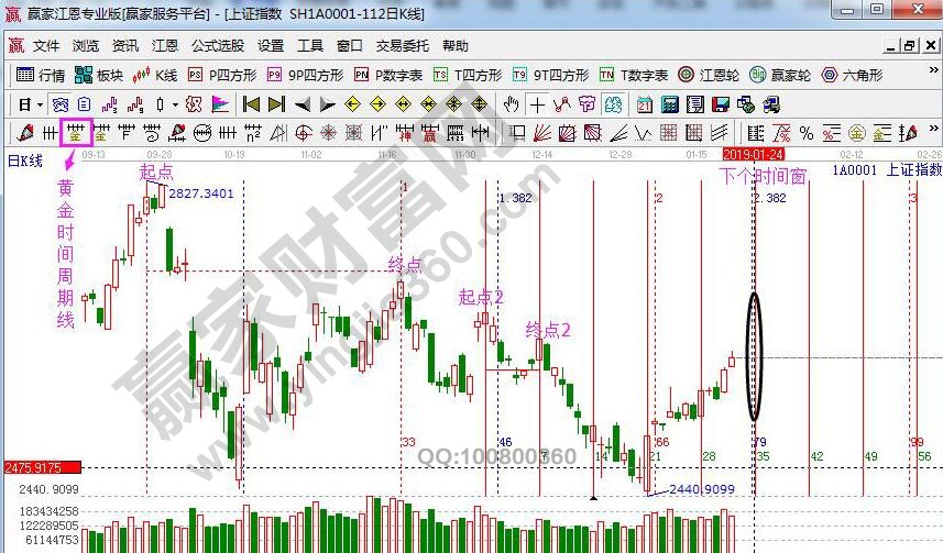 ☆依據贏家江恩理論系統黃金時間周期線提示:以最近兩組高高點做圖,第一組(2827和2703),第二組是(2666和2645)做黃金時間周期線,下個時間窗口1月23、24號。