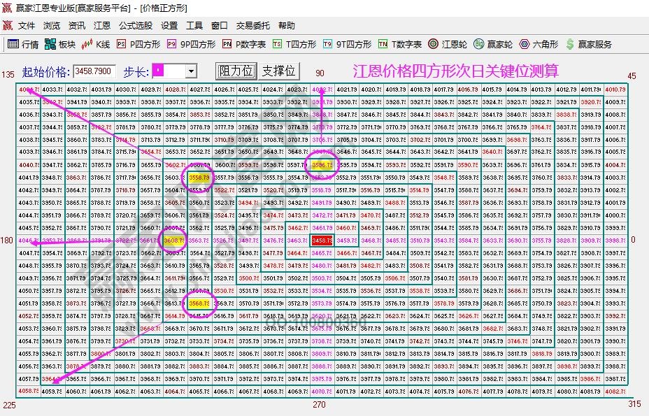 26號日內空間關鍵位測算:江恩價格四方形預判支撐3558、3568,壓力3596、3608。