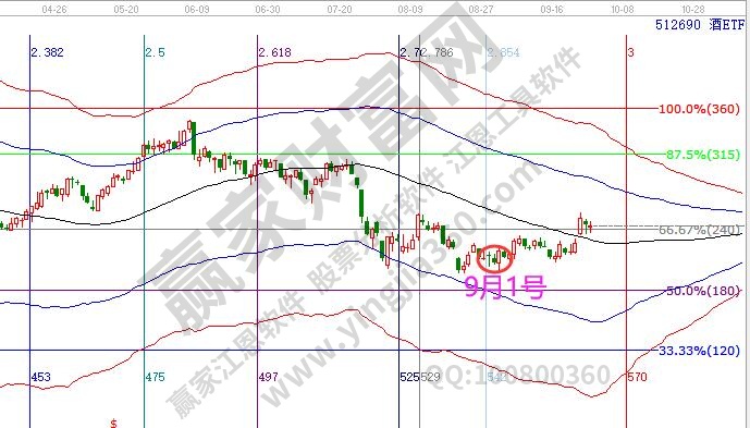 創(chuàng)業(yè)板:日線連續(xù)幾次上攻江恩百分比240度3252點(diǎn)收盤均在線下,隨著時間推移極反通道黑色生命線下移到240度附近,近兩個交易日短線已高拋的籌碼,等待日線再探江恩波段百分比180再做決策。時間工具顯示因假期日線級別下個時間窗口是10月8號,如圖。