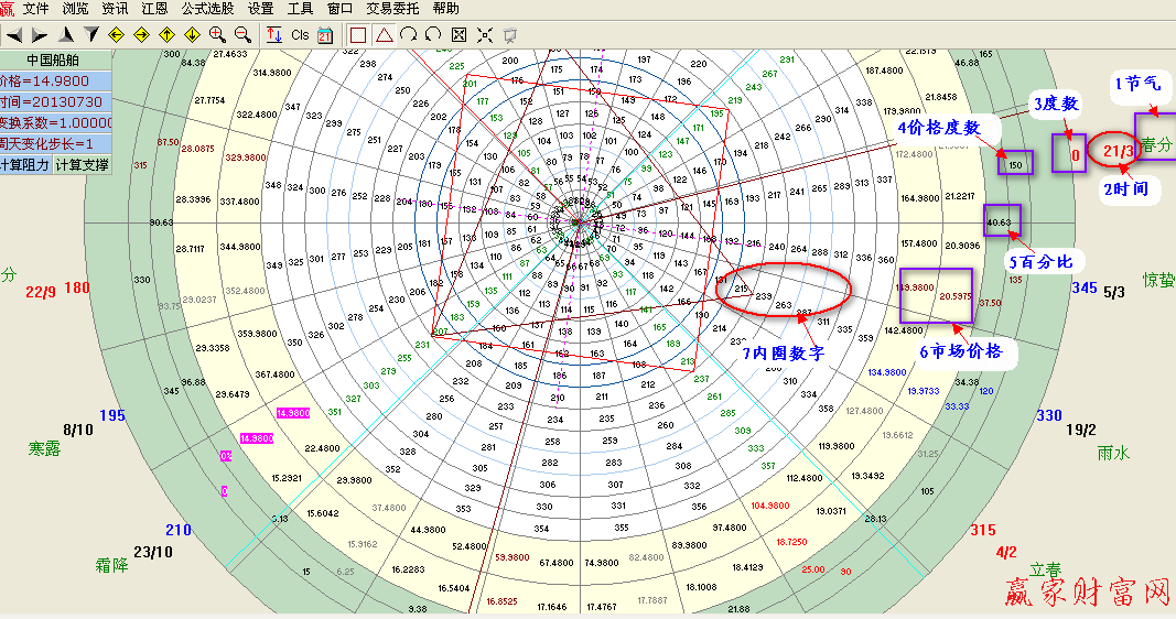 這里我們來了解下江恩輪中輪的實際構成。對照贏家江恩輪中輪工具圖,注意圖中標注數字的位置,每一圈的內容依次如下: