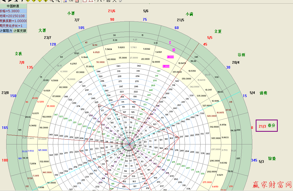 輪中輪的外圈起點是春分日=3月21日,江恩理論是按自然歷法規則來設計的.我們都知道地球公轉最快近日點是1月5日,地球公轉最慢遠日點是7月5日.1月20日——7月23日是一年中氣溫最極端的日子。聰明絕頂的江恩沒有用最極端的日子為起點,為什么選定3月21日為起點?只有靠我們去分析研究,我的理解是:我們公歷歷法年的開始為1月1日,按農歷年的開始為正月初一,按易經占卦年的開始為立春,3月21日正是春分時節。江恩精通圣經難道他不研究我們的易經嗎?西方人不研究我們古代火藥發明技術能制造出火箭來嗎?俄國人不為我們培訓大量高端人才我們的兩彈一星能在較短時間里上天嗎?,《日本蠟燭圖技術》為什么作者是美國人?這都是借鑒的結果。我們的24節氣與他的輪中輪周期不是巧合,我認為是他研究我們的易經的結果。他確定的日子周期點正是我們的24節氣轉換周期點。