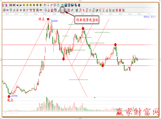Ⅰ.我們選擇最近歷史上一個(gè)有效的波段。鼠標(biāo)左鍵單擊轉(zhuǎn)折趨勢(shì)線圖標(biāo),凹陷表示選中,然后以2013年6月25日的低點(diǎn)5.87為起點(diǎn),以2013年9月13日的高點(diǎn)15.65為終點(diǎn)。