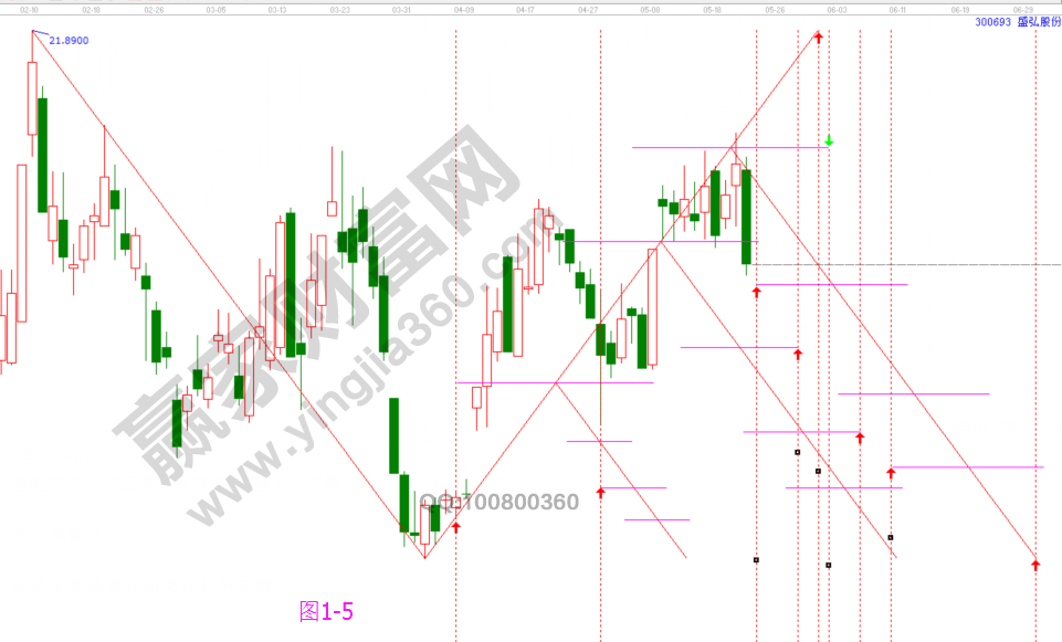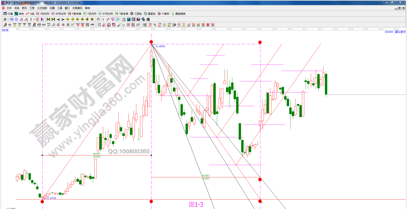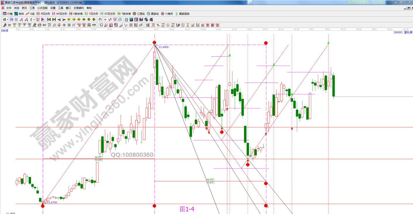 如圖1-3所示,與前兩圖對(duì)應(yīng)0425這四個(gè)點(diǎn),這個(gè)圖一做出來(lái)也不需要說(shuō)太多了(本文出自贏家財(cái)富網(wǎng)轉(zhuǎn)載請(qǐng)注明出處)。理想運(yùn)動(dòng)是股價(jià)用44天從11.67(0)波動(dòng)到21.89(4)再用44天從21.89(4)波動(dòng)到11.67(2)。注意:轉(zhuǎn)折趨勢(shì)線運(yùn)用的第一個(gè)點(diǎn):重點(diǎn)關(guān)注斜線!!!斜線42界定了兩個(gè)性質(zhì)的三角形區(qū)域,三角形234為下跌的時(shí)間換取下跌空間區(qū)域。股價(jià)持續(xù)運(yùn)行于此區(qū)域,易創(chuàng)出11.67的新低,為逢高拋售區(qū)域;三角形241區(qū)域?yàn)橄碌目臻g換取下跌時(shí)間區(qū)域,股價(jià)持續(xù)運(yùn)行于此區(qū)域,不易創(chuàng)出11.67新低,易創(chuàng)出21.89新高,為逢低吸納區(qū)域。此區(qū)域如何高拋低吸?見(jiàn)圖1-4!