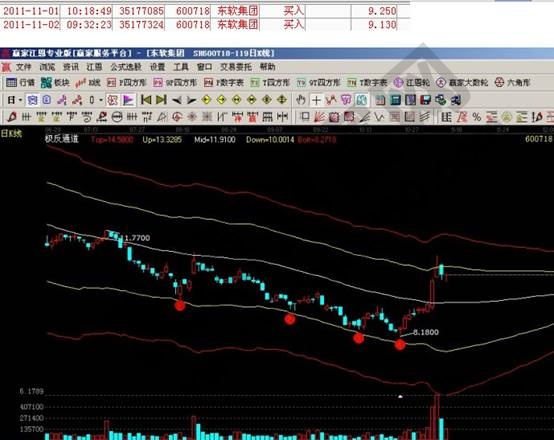 在11年11月1號放2倍量能突破長期下降趨勢通過,并且運行至贏家特色趨勢工具極反通道生命線附近,有突破需要,操作個股技術需求滿足;再來看消息面,隨之軟件行業十二五規劃利好消息帶動,整體板塊異動,軟件用戶通過工具分析,在生命線附近關注,黃色外軌線獲利出局,兩天獲利16%;