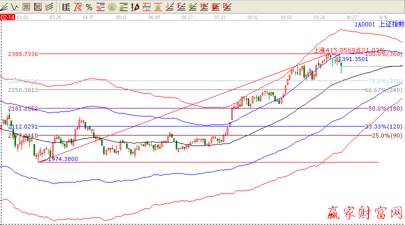 技術分析:依據贏家江恩系統極反通道提示,昨日試圖嘗試突破極反通道藍色上軌線未果,從圖中可以看到大盤已經三天受到藍色上軌線的壓制,所謂事不過三,今日跳水,下周繼續關注這個位置,如果突破可以考慮建倉,如果不突破建議空倉觀望,下方支撐2290附近。】