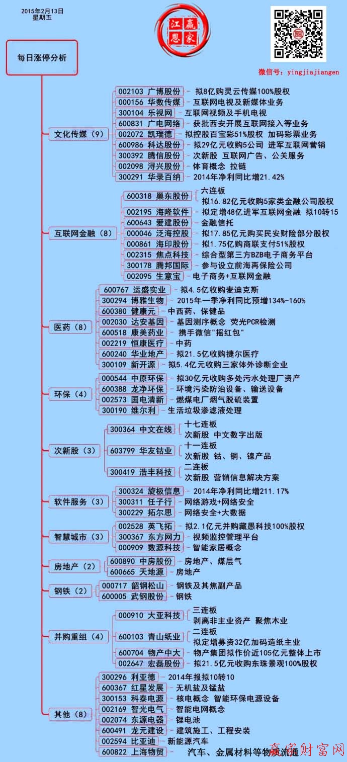 今日滬深兩市早盤大幅高開,在打新解凍資金和央行放水的利好刺激下,大盤一路上行,表現(xiàn)的相當(dāng)強(qiáng)勢。但午后出現(xiàn)一波跳水行情,截止收盤漲幅收窄。從盤面上看,P2P、脫硫脫硝、智能電視表現(xiàn)搶眼,均大漲3%以上;兩市只有券商一個(gè)行業(yè)板塊下跌。截止收盤,共有54只個(gè)股漲停。以下將對部分股票漲停原因進(jìn)行分析: