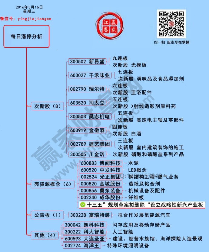 漲停原因揭秘:消息面上,據媒體報道,3月15日,從全國“兩會”新聞中心獲悉,根據證監會意見,十三五《綱要草案》將刪除“設立戰略性新興產業板”的內容。據財新權威人士稱,沒有寫進“十三五”規劃綱要中,意味著“戰略新興產業板”不再設立。消息利好殼資源概念股。