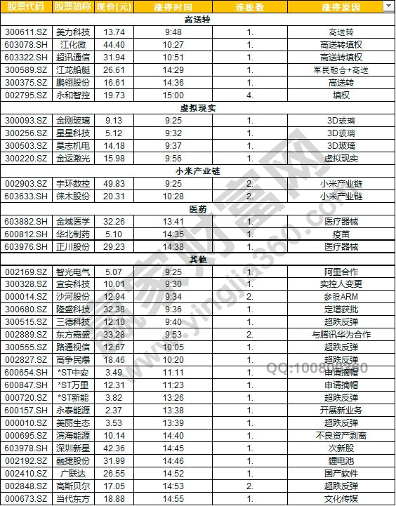 盤面上,妖股華鋒股份(002806)尾盤炸板盤中最大振幅超14%,由華鋒股份衍生的填權邏輯隨著永和智控(002795)4連板得以擴散,同屬17年填權的美力科技(300611)、昊志機電(300503)底部跟風拉板。老填權的火爆,刺激今年的新填權走強,今天除權的江化微、超訊通信成功漲停。醫藥醫療板塊午后爆發,正川股份(603976)、金域醫學(603882)等多股漲停。芯片概念再度崛起,江化微漲停,盈方微(000670)盤中一度漲停,紫光國芯(002049)、韋爾股份(603501)、兆易創新(603986)等個股均大漲。農業股尾盤逆市走強,宏輝果蔬(603336)、香梨股份(600506)均大漲超7%。