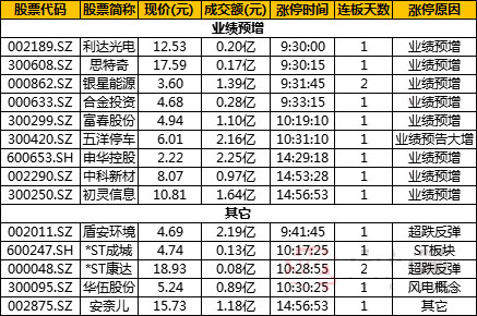 業績預增 封板效率:一般