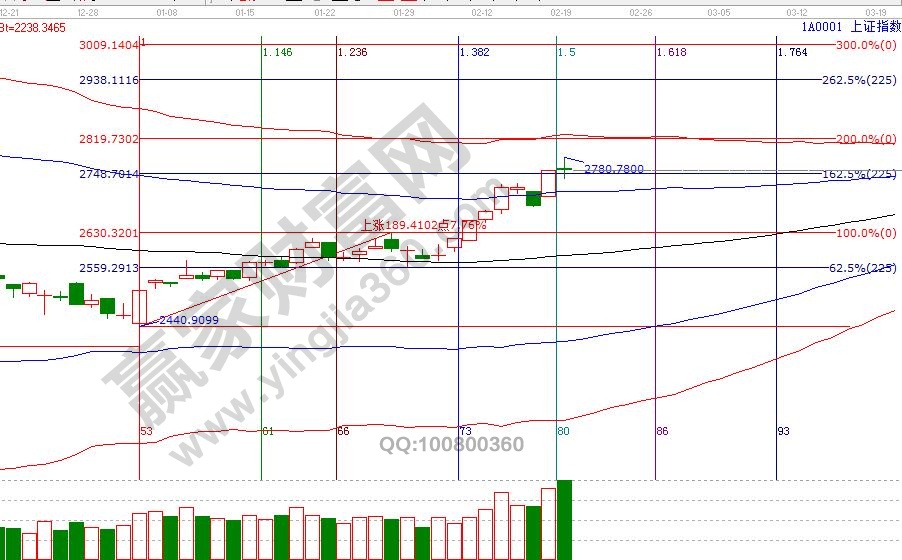 大盤在極反通道藍色上軌線與紅色外軌線構造的超強通道內運行,此區域代表市場熱度較強,板塊、個股均有機會輪番表現,享受市場瘋狂的同時,但要小心瘋狂背后不斷積累的風險,目前工具還未出現警示信號,按規則穩健者關注15分鐘生命線得失,激進者關注60分鐘生命線得失;空間點位上,江恩百分比、江恩價格四方形提示,2730、2720是支撐,2765、2778為壓力,時間窗口是28號。操作策略,大盤日K線從強勢通道進入超強通道,個股波動空間增大,分批高拋藍色上軌線或紅色外軌線壓力個股,倉位切換至生命線附近有量能配合的個股,整體倉位保持在5-6成。