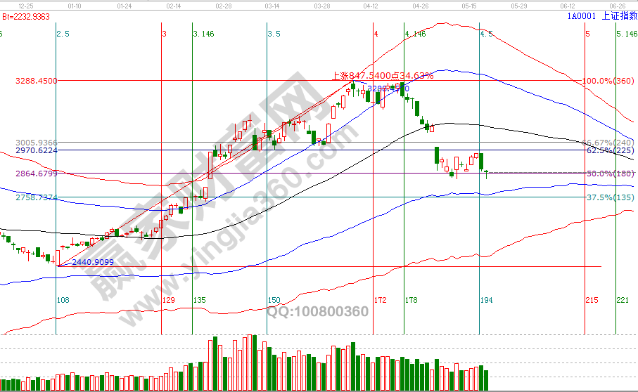 5月除9號至17號時間窗口有一次操作機會外,判斷的本月還會有一次布局機會,從空間波段百分比1倍循環二分位2834點與極反通道藍色下軌線(詳見工具)是參考區間,贏家江恩系統時間周期方面,本周短周期重要時間窗口是23號,日線時間窗口是28(29)號。通過系統工具預判方法得出參考空間與時間后,投資者要做的就是跟隨市場并做出應對策略,并且預判此區間展開的反彈要強于第一波,具體空間與時間會在系統VIP學員公布。21號盤中壓力是90度2894點、135度2870點,盤中支撐是315度2844點、270度2829點。操作策略,指數擊破黑色生命線進入弱勢區域,高風險者倉3成,低風險者本周進入備戰等待信號。