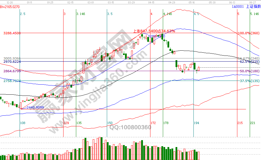 5月10號、20號,大盤日K線分別回探波段百分比延伸線1倍循環二分位2834點后止跌企穩,第一次反彈止步于短周期60分鐘生命線位置,本次關注此線能否突破站穩(學員通過工具查看關鍵位),站上此線則指數日k線回補下方缺口的概率將降低(但不排除),23號短周期時間后會再次進行評估。投資者應好好把握當前機會,待整固結束后市場必會有一波反彈到生命線的機會。本周短周期重要時間窗口是23號,日線時間窗口是28(29)號。22號盤中壓力是180度2928點、225度2944點,盤中支撐是90度2894。操作策略,指數擊破黑色生命線進入弱勢區域,高風險者倉3-5成,低風險者本周進入備戰期擇機參與。