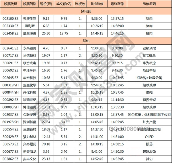 盤面上,中國保利集團有限公司與中國中絲集團有限公司實施重組,久聯(lián)發(fā)展(002037)直線封板;養(yǎng)殖板塊小幅上漲飄紅,天康生物(002100)漲停,得利斯(002330)、德美化工(002054)大幅拉升;農(nóng)業(yè)股午后拉升,敦煌種業(yè)(600354)沖擊漲停;ETC概念出現(xiàn)分化,華信新材(300717)、星帥爾(002860)漲停。ST板塊走弱,*ST節(jié)能(000820)等近20股跌停。個股方面,新城控股(601155)一字跌停,博信股份(600083)午后上演“地天板”走勢,盤中一度漲停。