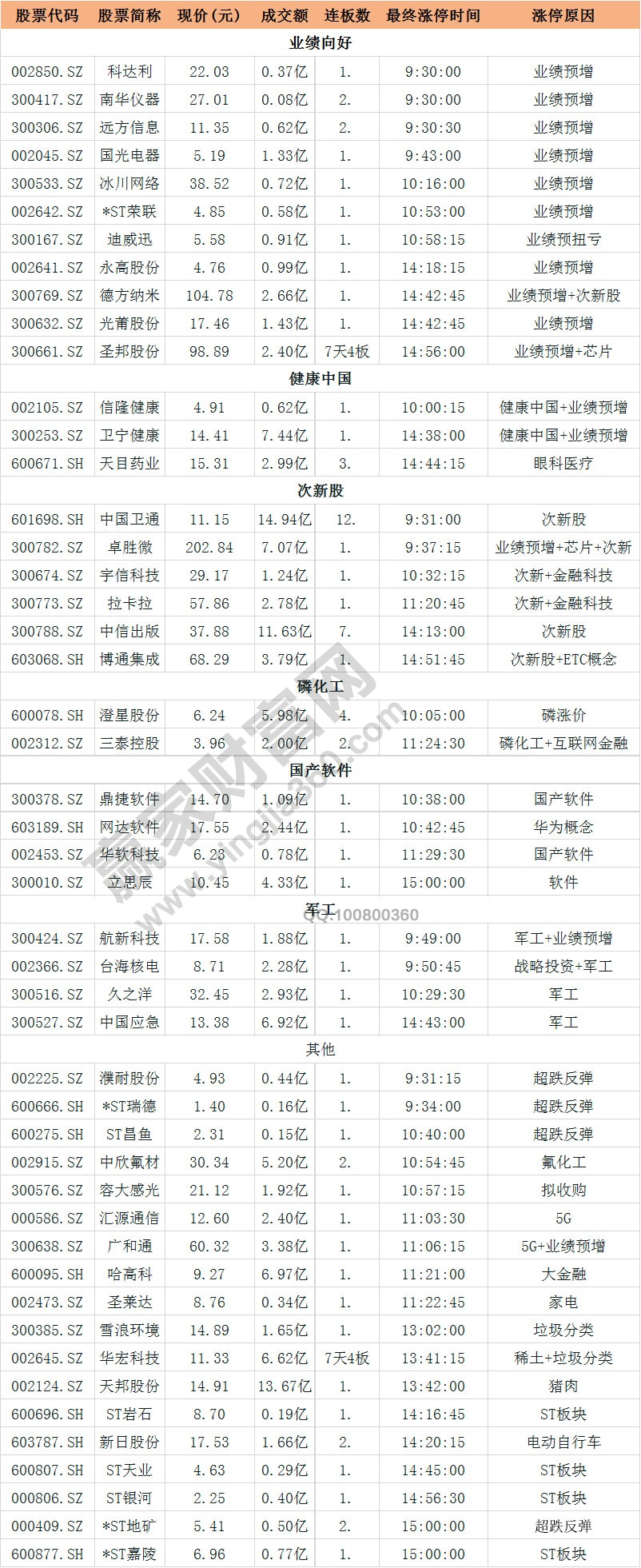 盤面上:養(yǎng)殖股午后明顯走強,天邦生物漲停,大北農(nóng)(002385)、牧原股份(002714)集體漲超5%;廣電系板塊異動,廣電網(wǎng)絡(luò)直線沖板,廣西廣電(600936)、貴廣網(wǎng)絡(luò)(600996)跟漲,消息面上:陜西廣電網(wǎng)絡(luò)與華為簽訂戰(zhàn)略合作協(xié)議;中船系板塊全天領(lǐng)漲,中國應(yīng)急(300527)、久之洋(300516)漲停,帶動軍工股一度走高;金融科技及國產(chǎn)軟件概念股表現(xiàn)活躍,華軟科技(002453)、網(wǎng)達軟件(603189)、宇信科技(300674)等多股漲停;澄星股份(600078)4連板走出市場高標、天目藥業(yè)(600671)3連板。