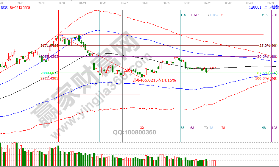 26號指數收盤正好在江恩價格四方形測算的2944點,保持在極反通道生命線2927點上安全區域運行,外因與場內資金不活躍兩因素,同時上攻期將逐步遇藍色上軌線反壓力,按時間、空間循環判斷,維持24號觀點,波段百分比240度2878點支撐,向上反攻第一目標是0度2966點,第二目標是60分鐘藍色上軌線,運行時間周期為8月1號。7月29號盤中壓力是270度2961點、315度2978點,盤中支撐是180度2928點、135度2911點。操作策略,指數極反通道生命線震蕩,信號延續價格目標看60分鐘上軌線,時間周期看8月1號,信號結束為上證50失守60分鐘生命線,整體持倉保持3成。
