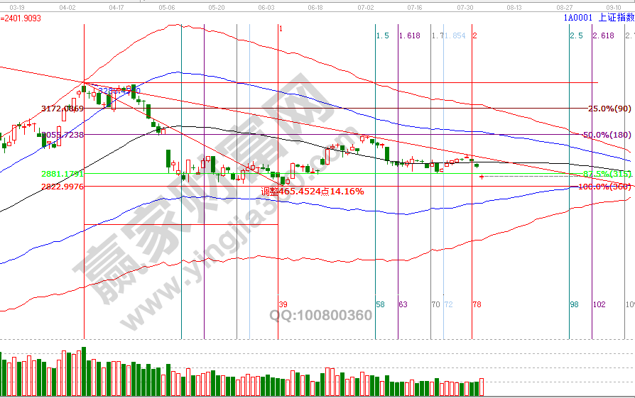 7月2號3048點(江恩價格四方形測算3051點)、30號2965點(百分比測算2966點),贏家江恩大勢分析無論是從時間、還是大盤點位均提前做出測算并給出應對策略,大方向在7月13號、20號公開視頻課講到下半年策略,指數測算8月底、9月會出現一個關鍵低點,江恩時間四方形測算,8月時間窗口是9號、16號、24號(向后推是26號);本周關注波段百分比延伸線120度(2791點)至180度(2834點),計劃波段倉會開始分批參與。在市場回調期,贏家技術團隊已于7月24號在VIP學員區公布關注板塊,這兩個板塊經過測算是波段機會(1-3月),會成為調整期明星板塊。8月5號盤中壓力是45度2877點、90度2894點,盤中支撐是315度2844點、270度2829點,8月時間窗口9號、16號、24號。操作策略,指數極反通道生命線進入弱勢通道,按失守一線看低一線規則藍色下軌線是目標位,短線機會跟蹤60分鐘周期,投資者保持3成以內或空倉。