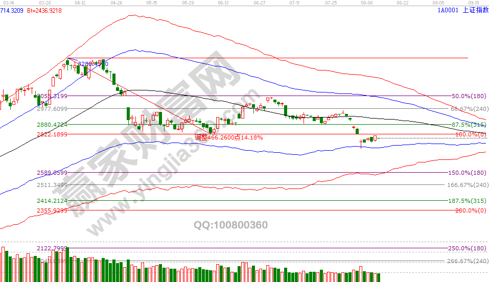 12號的分析中講了時價等倍關系及反抽力度之弱,16號將遇日線時間窗口,代表價格將再會有一次劇烈波動,跟蹤好指數短期走勢,目前關系是大周期制約小周期,小周期引導大周期,其結論是反抽還有空間(時間未到)但受趨勢限制,這也是12號談到第一次分批先獲利部分籌碼的原因。8月14號盤中壓力是225度2815點、270度2829點,盤中支撐是135度2786點、90度2772點,本周五日線時間窗口。操作策略,指數生命線下弱勢區運行,激進者3成倉交易,穩健者空倉休息。