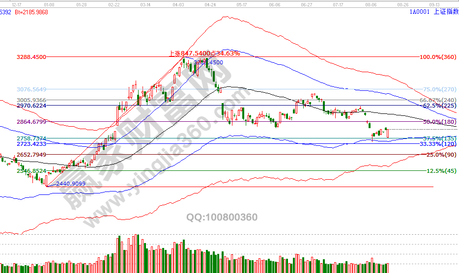 先回顧下近期預(yù)判,6號指數(shù)觸及日線極反通道藍色下軌線2744點定性反抽開始,并測算時間指向16號,空間指向百分比延伸180度2834點(14號最高點2829點)。16號是8月日線級別時間窗口,趨勢方面明天指數(shù)將確認(rèn)一重要關(guān)鍵線,影響著下一個時間周期的走勢。13、14號分析中談到的一次價格快速波動期是連續(xù)的,按歷史規(guī)律15分鐘再度失守生命線指數(shù)將直逼6號低點。激進者剩余最后一批倉以百分比延伸線120度2791點得失做決策。8月16號盤中壓力是225度2815點、270度2829點,盤中支撐是135度2786點、90度2772點。操作策略,指數(shù)生命線下弱勢區(qū)運行,激進者3成倉以內(nèi)交易,穩(wěn)健者空倉休息。