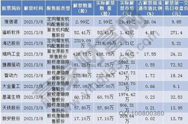 其中,有四只股票解禁市值超億元,分別是福昕軟件解禁市值1.42億元,52.41萬股,占比前流通市值4.81%;海達股份解禁市值1.21億元,2319.09萬股,占比前流通市值5%;維信諾解禁市值29.79億元,2.99億股,占比28.04%;、瑞瑪工業解禁市值1.06億元,438.75萬股,占比前流通市值17.55%。定向增發機構配售股份是海達股份,維信諾,首發原股東限售股份是瑞瑪工業,福昕軟件。