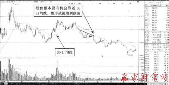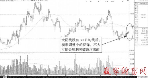 如上圖所示,持續(xù)大跌的走勢出現(xiàn)之后,30日均線對于股價楔形反彈的壓制作用還是非常大的。圖中出現(xiàn)的楔形調整走勢中,股價反彈的幅度雖然不大,但是卻已經靠近了30日均線。股價跌破30日均線后,該均線就對股價產生了強大的壓制作用。圖中該股暴跌了8.83%的時候,明確地顯示出了該股反彈所面臨的阻力空前的大。投資者唯有在靠近30日均線的過程中減持該股,才能夠減少損失。