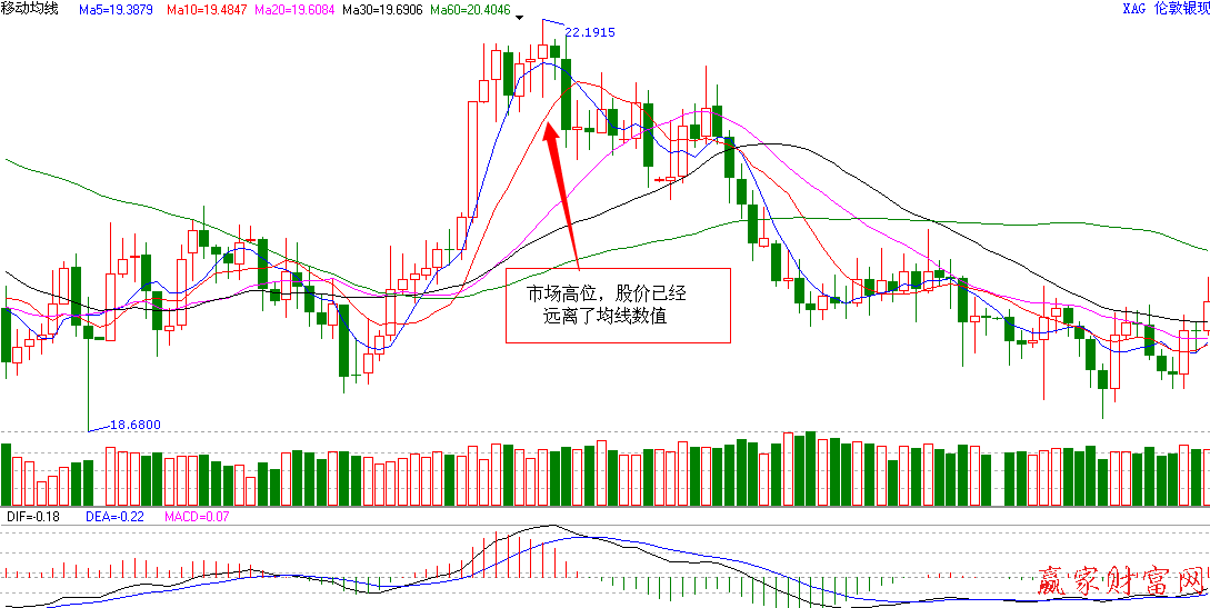 移動平均線代表著近期內購買股票的平均成本,因此如果股價極度的偏離了移動平均線,就說明市場已經處于不正常的交易過程。如果股價遠遠高出了移動平均線的數值,就說明這個時候在此點位購買股票所付出的代價遠遠超出了平均成本,不會再有更多的人愿意在這個時候購買股票,所以未來股價向下出現回調的可能性很大,甚至可能出現反轉行情。在這里我們為大家介紹的只是均線理論中的九牛一毛,想要更深入了解還請關注贏家江恩。