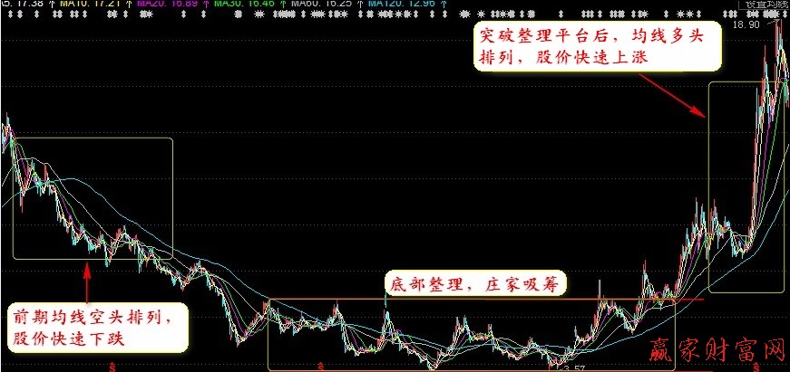 一般來說,如果股價從高位快速下行,則均線一般多給出空頭排列的形態,說明股價下跌的幅度很深。當股價接近市場的底部,由于主力機構在底部隱蔽的吸納籌碼,股價會停止或者放緩下跌的腳步,而在一個相對窄的范圍內上下波動,均線系統也會出現相互纏繞黏合的走勢,而從黏合狀態開始向上發散時,就是投資者買入的時機,因為此時主力機構已經建倉完畢,成交量將會快速增大,伴隨著股價快速上揚。