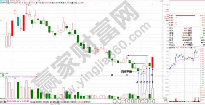 如果上圖所示,這只股票就是逆市漲停,所以我們就可以將這些分析濃縮為四句話,即凹底真底不破,梯四縮量假跌,假跌柱上設伏,擇型擇機淘金。