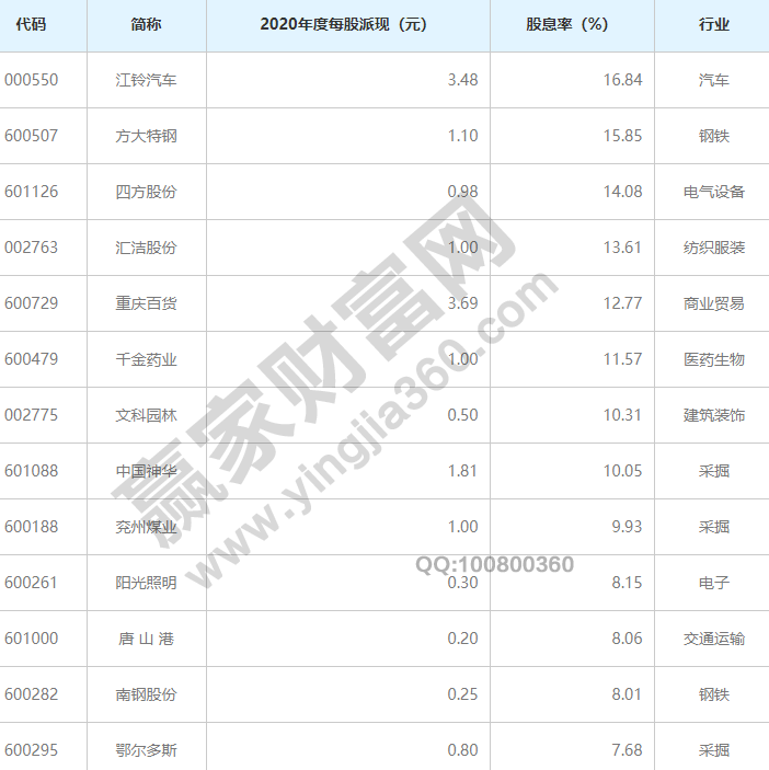 五年均值前10名,股息率區間為10.9%-5.8%: