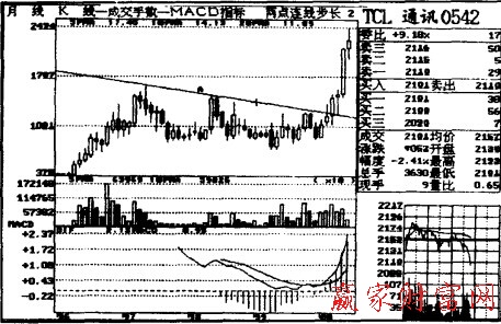 例如:TCL通訊(0542),即以前的粵TCL。該股在上市的時候,明顯有主力介入。但股價一直受到上市以來所形成的下降趨勢線所壓制。至2000年3月31日,股價終于有效突破月K線圖中的下降趨勢線,從而走出一波較好的行情。投資者可在有效突破壓力線時介入。如下圖。