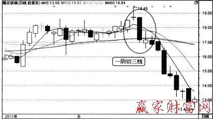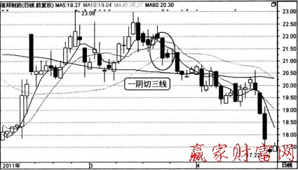 一陰切三線也可稱為斷頭鍘,斷頭鍘很形象地說明了這種K線形態(tài)對股價(jià)和未來走勢的影響。此時(shí)空方勢力突然爆發(fā),多頭能量被迅速打壓,出現(xiàn)這種情況后一定要注意尋找賣點(diǎn)。