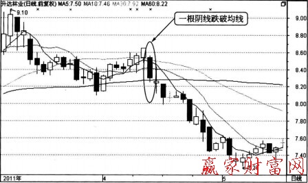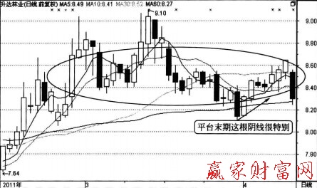如下圖所示為升達(dá)林業(yè)2011年2月到4月的走勢。從圖中可以看出,該股在平臺后突然一根大陰線跌破多日均線,此時(shí)股價(jià)走壞的幾率大增,再如下圖所示。