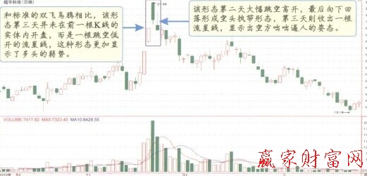 1.由于雙飛烏鴉第三天陰線的收盤價已深入到第一天陽線的實體內,因此該形態比雙鴉躍空的看跌意味更濃,而且后兩根陰線實體越長,反轉意義也越強烈。