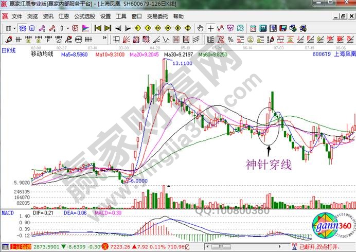 神針穿線是怎么樣的?它其實指的就是:一根K線成功穿過短線、中線、長線三條異動平均線。當然也就是前面我們所說的一針穿三線的情況。它其實是一種強烈的底部或頂部單日反轉的信號,當然這種形態的出現,投資者應該進一步的進行確認。