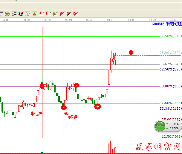 ,用近期的重要高點(2014年2月27日)作為起點,重要的低點(2014年2月27日)作為終點,連個點位連接一下,重要的時間變盤點就出來了,豎線就是時間,2014年3月7日重要的變盤點,2014年3月21日重要的變盤點,都在線上,然后結合江恩百分比做買賣點,2014年3月7日時間點,同時還在江恩百分比50%的壓力位,所以股票直接向下回踩,直到2014年3月21日回踩到支撐位33.33%的位置,這個位置形成了重要支撐,同時這個是重要的買點,此買點到今日盈利應該在30%左右,未來我們要關注的時間點是4月14日,大家拭目以待,高點的出現!