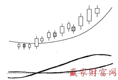 4.當(dāng)DIF線(xiàn)和MACD線(xiàn)先后向上突破0值線(xiàn)時(shí),說(shuō)明該股股價(jià)開(kāi)始進(jìn)入中期上升階段。這是日MACD指標(biāo)顯示的持股待漲信號(hào)之一。如圖所示。