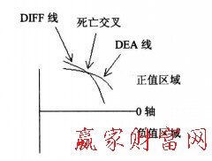 MACD調頭向下也可以發生在負值區域,即在0軸下方運行,出現MACD調整向下,表示反彈結束,這時投資者要果斷拋空,如圖所示。