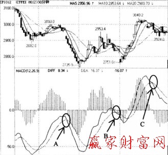 在B處,期價經過反復的震蕩,在接近0軸時MACD指標出現了死亡交叉,這時也可以適量做空。期價經過短暫回調后,又開始上漲,在C處,即在正值區域MACD指標又出現了死亡交叉,這時投資者要及時做空。