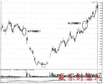 在成交密集的反轉(zhuǎn)或整理形態(tài)完成之后,股價(jià)突破阻力或跌破支撐時(shí)出現(xiàn)大幅度上漲或下跌所形成的缺口,稱為突破缺口。突破缺口的出現(xiàn)一般視為股價(jià)正式突破的標(biāo)志。在股價(jià)向上突破時(shí),必帶有大成交量的配合。缺口越大,股價(jià)未來的變動(dòng)越劇烈。