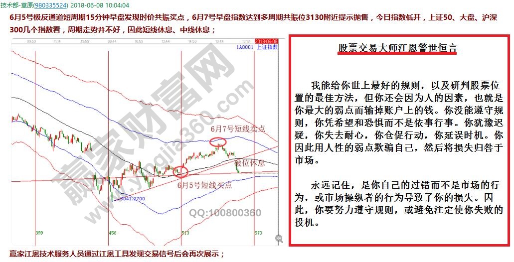 5月25號(hào)贏家江恩看空市場(chǎng),并且按規(guī)則行事空倉(cāng)休息,躲過(guò)了5月30日的百股跌停,6月5號(hào)短周期15分鐘發(fā)出短線信號(hào),6月7號(hào)短線達(dá)到既定位置提示拋售,今日的下跌再次規(guī)避。踏準(zhǔn)市場(chǎng)節(jié)奏,短線才能提高成功率、收益比。