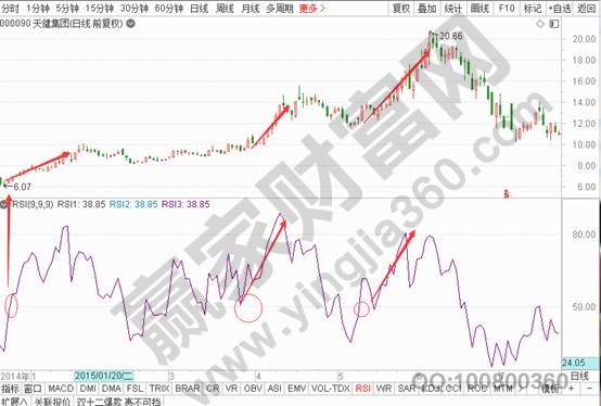 1、 股票呈現(xiàn)多頭趨勢的話,RSI突破50值就是買點。如果是賺了的話,就可以逢高離場,如果賺了錢沒有離場的話,一旦RSI跌破50值那么就是賣出點位。如下面的天健集團(tuán)走勢圖。