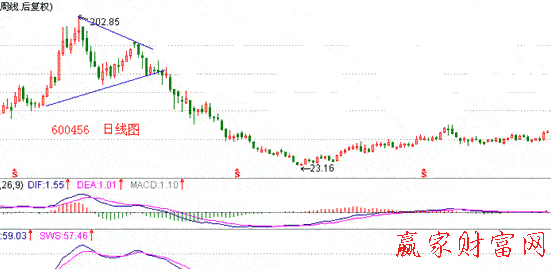 如所上面的日線圖所示。其k線組成的形態在頂部呈現出三角形的形態。將此形態和之前我們所說的擴散頂比較的話,就能夠很輕易的發現,發現二者之間的的不同之處,三角形的頂部形態內部的K線走勢是處于一個不斷收斂的態勢之中,其間往往伴有量能萎縮交投萎靡不振,此時的市場心態處于一個格外謹慎的狀態,許多投資者都冷眼立場觀望,但是如果說股價一旦作出選擇跌破下軌的舉動,那么理性的投資者都會不由余力殺跌迅速的離場出局,其后市跌幅相當的不容樂觀。