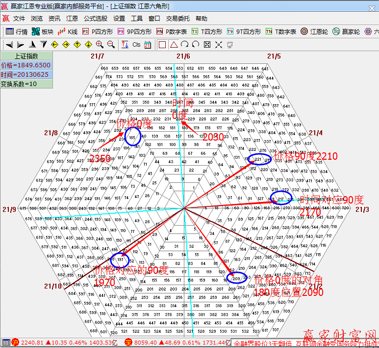第一步,確定起點,我們以13年6月25日,1849.65點作為起始點,1849縮小10倍,“185”在六角形中找到相對應的位置,這樣時間,價格的0度全部有了,